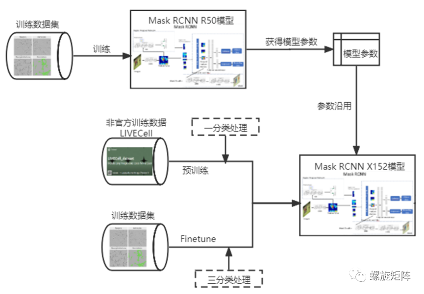 4. 多层分类处理,预训练时使用一分类方法,让预训练模型更加关注Mask,Fineture时用三分类处理,让模型关注到不同类别的细胞。
